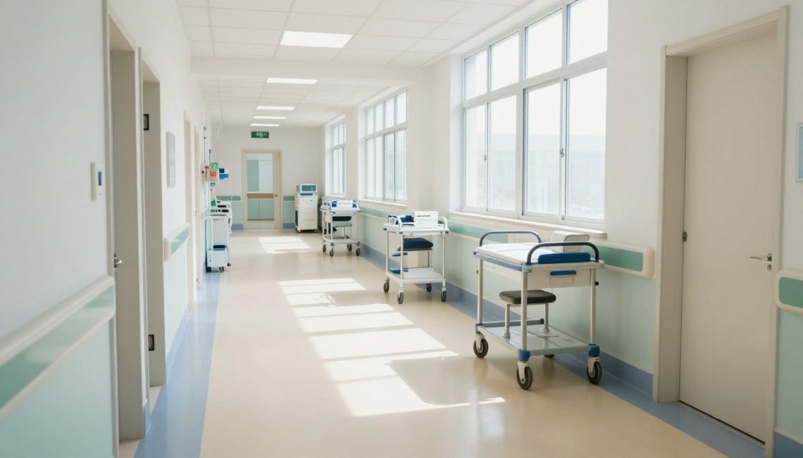 Clean homogeneous sheet vinyl flooring installed in a modern hospital corridor, featuring bright lighting, medical equipment carts in the background, and a wide-angle view of the seamless floor surface in realistic photography style with natural daylight.
