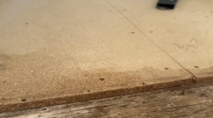 | Particle board is a thin underlayment layer | Remove and rebuild with plywood underlayment | Stops seam swell and improves fastener hold |